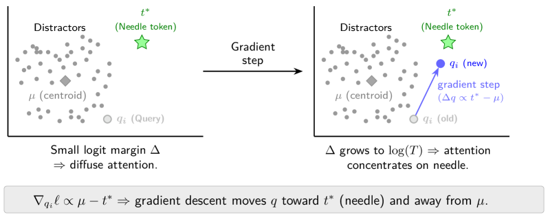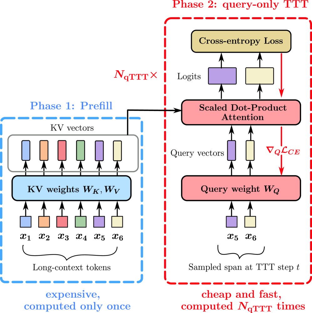 이러한 문제를 해결하기 위해, 본 연구는 쿼리 전용 테스트 시간 학습(query-only test-time training, qTTT)이라는 새로운 방법론을 제안한다. qTTT는 주어진 컨텍스트에 대한 목표 그래디언트 업데이트를 통해 정적 자기 어텐션의 한계를 극복하며, 긴 컨텍스트에서의 성능 향상을 목표로 한다. 실험 결과, qTTT는 기존의 추론 시간 전략보다 더 효과적인 접근 방식을 제공하며, Qwen3-4B 모델에서 LongBench-v2 및 ZeroScrolls 벤치마크의 하위 집합에 대해 평균 12.6% 및 14.1% 포인트의 성능 향상을 이끌어낸다.