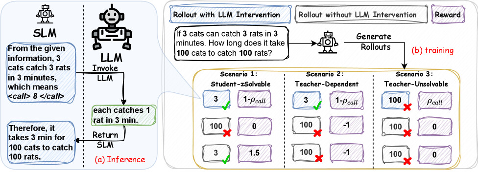 RelayLLM의 핵심은 SLM이 특정 조건에서 LLM의 개입을 요청하는 특별한 명령 토큰인 <call>을 생성하는 것이다. SLM은 기본적으로 토큰을 생성하며, <call> 패턴이 감지되면 LLM이 현재 컨텍스트를 받아 추가적인 토큰을 생성하게 된다. 이 과정은 SLM과 LLM 간의 반복적인 릴레이를 통해 이루어지며, SLM은 LLM이 생성한 토큰을 기존 컨텍스트에 추가하여 추론을 지속한다.