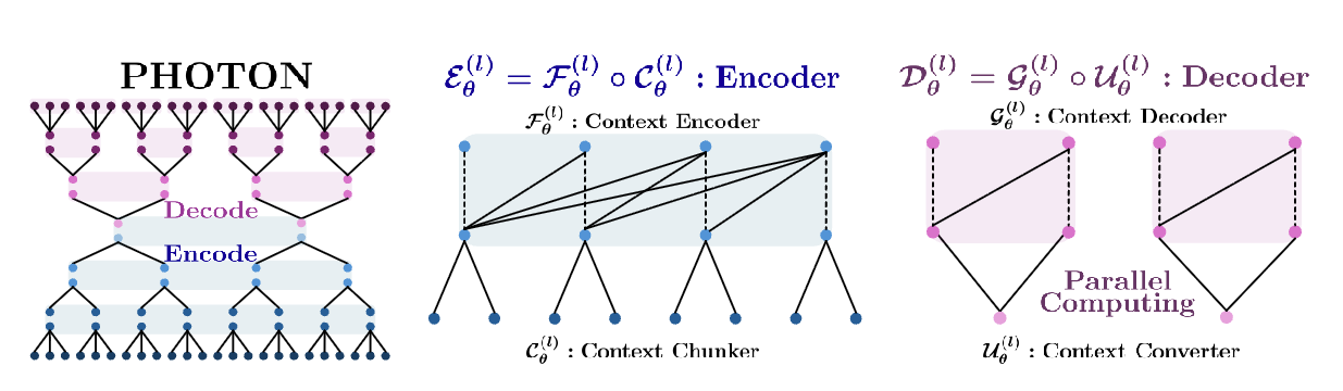 PHOTON의 구조는 하향식 인코더와 상향식 디코더로 구성되어 있으며, 인코더는 입력된 토큰 시퀀스를 저속도 컨텍스트 상태로 압축하고, 디코더는 이를 바탕으로 세밀한 토큰 표현을 재구성한다. 이러한 계층적 접근 방식은 각 수준의 상태가 이전 수준의 상태를 그룹화하고 요약하여 처리함으로써 메모리 사용을 최적화하고 처리 속도를 향상시킨다. 실험 결과, PHOTON은 긴 컨텍스트와 다중 쿼리 작업에서 기존의 트랜스포머 모델보다 우수한 성능을 보였으며, 메모리 단위당 최대 10^{3}\times 높은 처리량을 제공하였다. 이는 디코드 시간의 KV 캐시 트래픽을 줄이는 데 기여하여, 효율적인 언어 생성이 가능하게 한다.