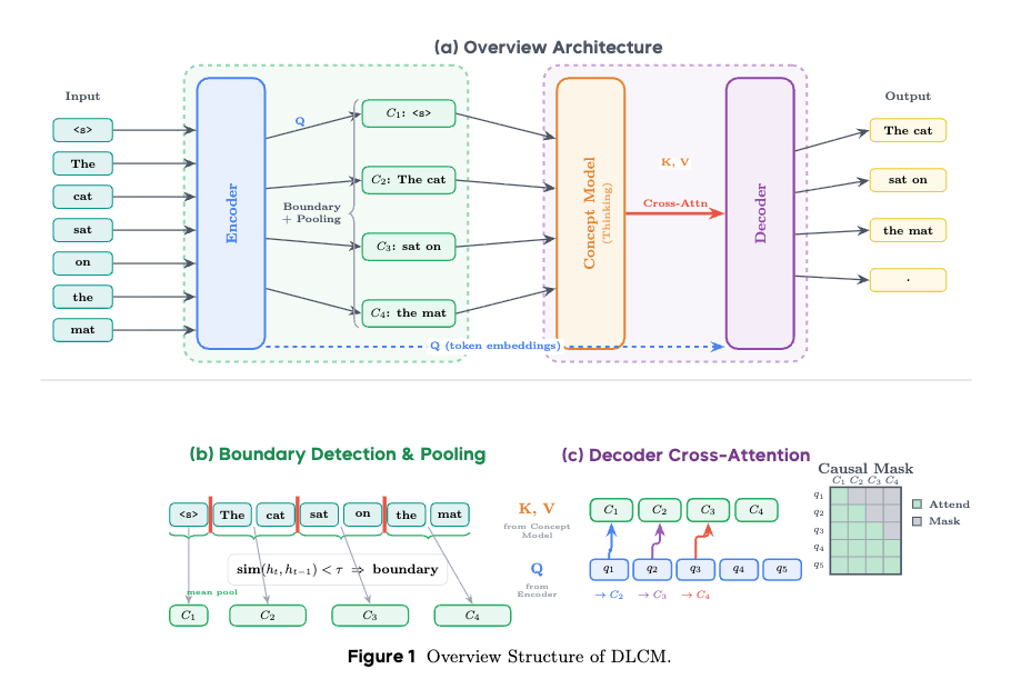 DLCM은 미리 정의된 언어 단위에 의존하지 않고 가변 길이의 개념을 엔드 투 엔드로 발견하는 혁신적인 방법론을 채택하고 있다. 이 모델은 계층적 압축을 통해 스케일링 행동을 근본적으로 변화시키며, 압축 인식 스케일링 법칙을 도입하여 고정된 부동소수점 연산(FLOPs) 하에서 토큰 수준 용량과 개념 수준 추론 용량을 분리하여 원칙적인 계산 할당을 가능하게 한다. 또한, 분리된 $μ$P 파라미터화를 통해 이질적인 아키텍처의 안정적인 훈련을 지원하며, 제로샷 하이퍼파라미터 전이를 가능하게 한다.