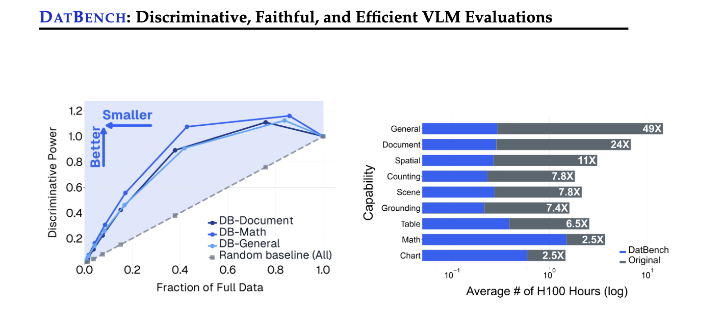 이 연구의 주요 기여 중 하나는 DatBench-Full과 DatBench라는 두 가지 평가 데이터셋을 개발한 것이다. DatBench-Full은 33개의 데이터셋으로 구성되어 있으며, VLM의 아홉 가지 기본 능력을 포괄한다. 반면, DatBench는 평균 13배의 속도 향상을 제공하면서도 원본 데이터셋의 차별성을 유지하는 고효율 하위 집합으로 설계되었다. 이러한 접근은 평가의 계산 비용을 대폭 줄이는 동시에, VLM의 실제 성능을 보다 정확하게 반영할 수 있는 기반을 마련한다.