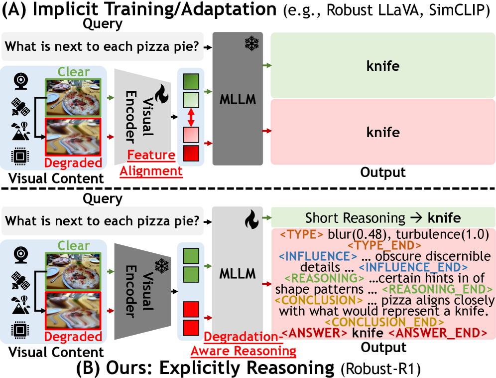 Robust-R1은 시각적 열화에 대한 강인성을 향상시키기 위해 설계된 혁신적인 프레임워크로, Multimodal Large Language Models (MLLMs)의 성능 저하 문제를 해결하고자 한다. 기존의 접근 방식들이 주로 시각 인코더의 일반화에 초점을 맞추어 암묵적 훈련 및 적응에 의존한 반면, Robust-R1은 열화를 명시적으로 모델링하는 구조화된 추론 체인을 도입하여 해석 가능성과 최적화의 통합을 추구한다.