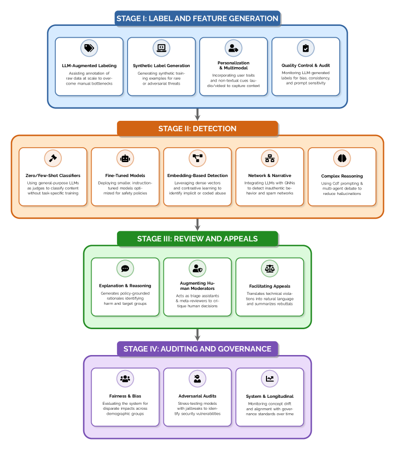 온라인 오남용 탐지 영역은 독성 발화, 괴롭힘, 조작, 사기성 행동처럼 서로 다른 양상을 지닌 위협이 빠르게 진화하는 환경에 놓여 있으며, 이에 따라 정적 분류기와 대규모 수작업 라벨링에 의존하던 기존 방식은 변화하는 정책 요구와 미묘한 맥락을 따라가기 어려워졌다. 이러한 문제의식 속에서 대규모 언어 모델(Large Language Models, LLM)은 문맥 추론, 정책 해석, 설명 생성, 심지어 다중 양식 이해까지 수행할 수 있는 도구로 부상하며, 단순한 탐지기를 넘어 안전성 시스템 전반을 지원하는 핵심 구성 요소로 확장되고 있다. 해당 논문은 이러한 가능성을 Abuse Detection Lifecycle(ADL)이라는 네 단계의 파이프라인으로 체계화하여, Label & Feature Generation, Detection, Review & Appeals, Auditing & Governance의 각 단계에서 LLM이 어떤 역할을 맡을 수 있는지 정리한다. 특히 방법론적으로는 LLM을 하나의 만능 모델로 간주하지 않고, 데이터 생성에서 탐지, 검토, 감사에 이르는 전체 흐름 속에서 각각 다른 실패 양상과 운영 제약을 가진 시스템 요소로 바라본다는 점이 중요하다.
