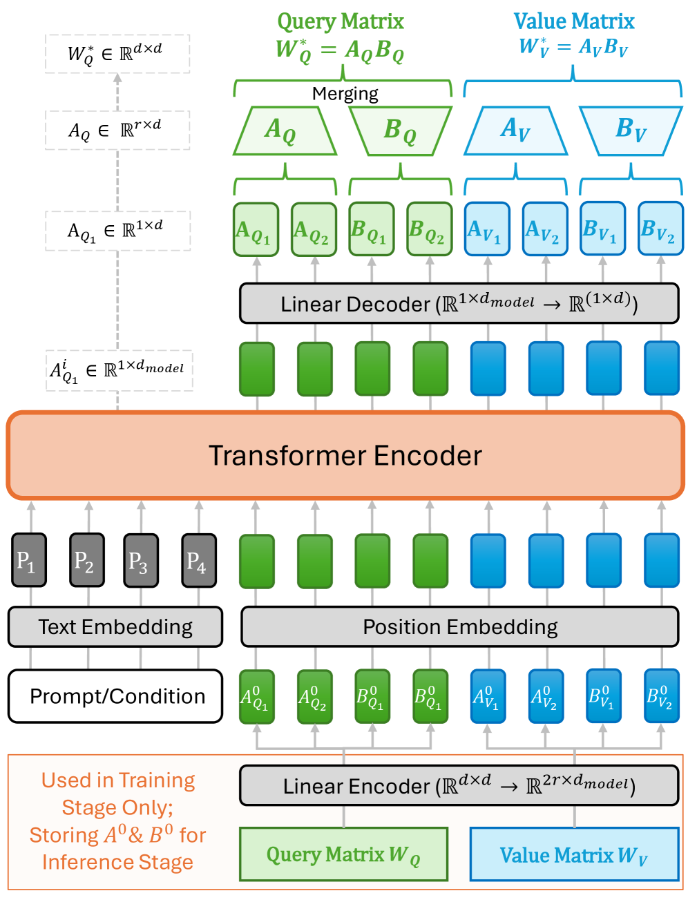 이 방법론의 핵심은 생성 모델을 완전히 새로 학습시키는 대신, 저랭크(low-rank) 구조를 활용한 파라미터 조합을 통해 기존 지식을 보존하면서도 입력 조건에 따라 유연하게 변형하는 데 있습니다. 다시 말해 Composer는 모델의 표현력을 외부에서 추가하는 것이 아니라, 각 입력에 맞는 생성 전략을 내부 가중치 수준에서 동적으로 구성함으로써 정적 파라미터화(static parameterization)의 한계를 넘어섭니다. 이러한 설계는 클래스 조건부 이미지 생성처럼 비교적 명확한 조건이 주어지는 상황은 물론, 텍스트-이미지 생성처럼 조건 해석이 복합적인 상황에서도 일관되게 작동하도록 일반화됩니다. 더 나아가 사후학습 양자화(post-training quantization)된 저정밀 모델에도 적용 가능하여, 성능 저하가 심한 환경에서조차 생성 품질을 회복하는 적응형 보정 메커니즘으로 기능합니다.