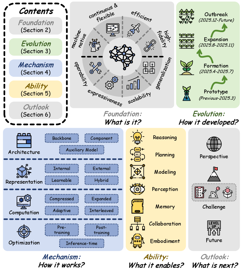 언어 기반 모델의 내부 계산을 이해하는 방식은 최근 명시적 토큰 생성에서 연속적 잠재 표현(latent representation)을 중심으로 한 접근으로 빠르게 이동하고 있으며, 이 논문은 이러한 변화를 잠재 공간(latent space)이라는 관점에서 체계적으로 정리합니다. 기존의 토큰 수준 추론은 언어적 중복, 이산화 병목, 순차적 비효율, 의미 손실이라는 구조적 제약을 지니는 반면, 잠재 공간은 모델이 더 압축적이면서도 풍부한 내부 계산을 수행할 수 있게 하는 계산 서브스트레이트로 제시됩니다. 특히 저자들은 잠재 공간을 단순한 중간 표현이 아니라, 추론, 계획, 기억, 인식, 협업, 체화된 행동을 함께 포괄할 수 있는 차세대 지능의 핵심 기반으로 재정의합니다. 이를 위해 서베이는 기초(Foundation), 진화(Evolution), 메커니즘(Mechanism), 능력(Ability), 전망(Outlook)의 다섯 축으로 연구 지형을 조직하며, 잠재 공간이 어떤 문제의식에서 출발했고 어떤 방식으로 확장되어 왔는지를 일관된 흐름으로 보여 줍니다. 먼저 Foundation에서는 잠재 공간을 명시적 언어 공간과 구분하고, 생성형 비전 모델에서의 latent space와도 다른 언어 기반 모델 내부의 계산 공간으로 명확히 정의함으로써 논의의 범위를 정돈합니다. 이어지는 Evolution에서는 연구가 압축적 계산에서 확장적 탐색, 적응형 제어, 그리고 명시적 토큰과 잠재 계산을 교차시키는 방식으로 발전해 왔음을 추적하며, 이 과정에서 효율성과 표현력의 균형이 점차 정교해졌음을 강조합니다.