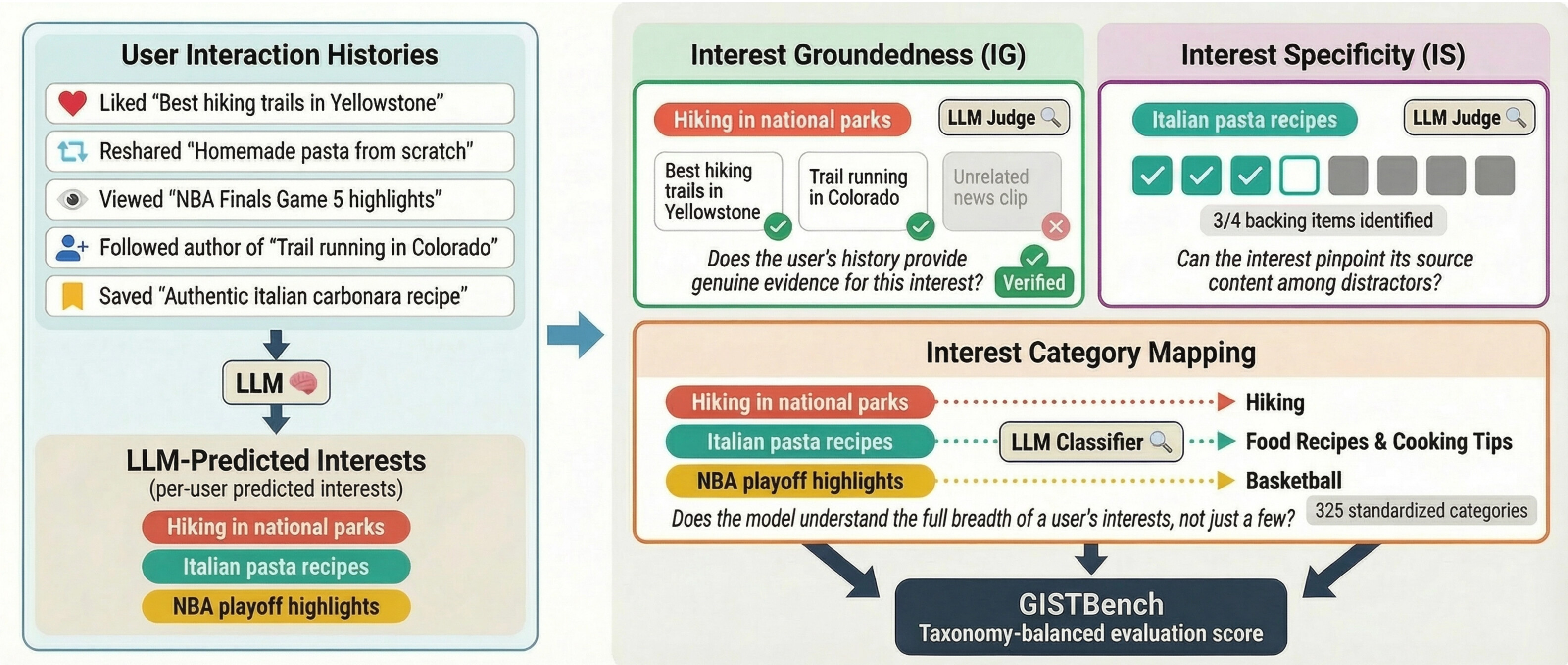 추천 시스템(Recommendation Systems)에서 대규모 언어 모델(Large Language Models, LLMs)을 활용한 사용자 이해는 단순한 아이템 예측을 넘어, 사용자의 실제 행동 기록을 바탕으로 관심사를 얼마나 정확하고 근거 있게 파악할 수 있는지에 대한 문제로 확장되고 있다. GISTBench는 바로 이러한 관점에서 LLM이 상호작용 이력으로부터 사용자의 관심을 추출하고 검증하는 능력을 평가하기 위해 제안된 벤치마크로, 그 중심에는 증거 기반 검증(evidence-based verification)이라는 엄격한 평가 철학이 놓여 있다. 기존의 추천 벤치마크가 주로 정답 아이템을 맞히는 정확도에 집중했다면, 이 접근은 모델이 제시한 관심이 실제로 좋아요, 저장, 공유, 시청과 같은 이질적인 행동 신호에 의해 지지되는지를 따져 묻는다. 이를 위해 논문은 Interest Groundedness(IG)와 Interest Specificity(IS)라는 두 계열의 지표를 도입했으며, IG는 정밀도와 재현율로 분해되어 환각된 관심 범주를 억제하면서도 실제 관심의 포착 범위를 함께 평가하고, IS는 검증된 사용자 프로필이 얼마나 구별 가능하고 개별적인지를 측정한다. 특히 IG를 계산하는 과정에서는 LLM judge를 이용해 예측된 관심에 연결된 증거 객체의 의미론적 관련성을 다시 판별함으로써, 단순한 표면적 유사성에 기반한 설명이 아니라 실제로 정당화 가능한 근거만 남기도록 설계했다.