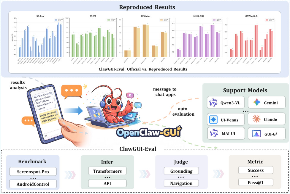 ClawGUI의 첫 번째 축인 ClawGUI-RL은 병렬 가상 환경과 실제 물리 디바이스를 모두 지원하는 GUI 에이전트 강화학습 인프라로 설계되었으며, GiGPO와 프로세스 보상 모델(Process Reward Model, PRM)을 결합해 단계 수준의 촘촘한 감독 신호를 제공합니다. 이는 최종 성공 여부만을 보는 희소한 보상 구조의 한계를 완화하고, 복잡한 UI 조작 과정에서 중간 행동의 품질까지 반영할 수 있게 한다는 점에서 방법론적 중요성이 있습니다. 두 번째 축인 ClawGUI-Eval은 6개 벤치마크와 11개 이상의 모델에 대해 추론, 채점, 메트릭 계산을 완전히 표준화하여, 서로 다른 논문 간 비교를 어렵게 만들던 프롬프트 형식, 좌표 정규화, 해상도, 샘플링 온도, 후처리 규칙의 차이를 최소화합니다. 이 표준화된 평가 체계는 공식 베이스라인 대비 95.8%의 재현율을 달성하며, 결과 비교의 공정성과 재현 가능성을 실질적으로 높였다는 점에서 벤치마킹 인프라로서의 가치를 보여줍니다.