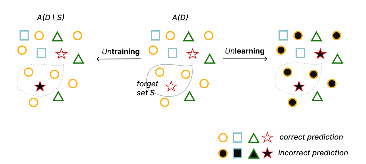 모델이 점점 더 커지고 더 많은 데이터로 학습됨에 따라, 학습된 모델에서 특정 데이터 포인트나 행동을 사후에 어떻게 삭제''할 수 있는지에 대한 관심이 폭발적으로 증가해 왔다. 이 목표는 머신 언러닝(machine unlearning)''이라 불려 왔다. 이 노트에서는 unlearning''이라는 용어가 과도하게 포괄적으로 사용되어 왔으며, 서로 다른 연구들이 두 개의 구별되는 문제 정식을 다루고 있음에도 불구하고 이러한 구분이 문헌에서 관찰되거나 인정되지 않았다고 주장한다. 이로 인해 알고리즘이 언제 동작해야 하는지에 대한 모호성, 서로 다른 알고리즘을 비교할 때 부적절한 지표와 기준선의 사용, 결과 해석의 어려움, 그리고 핵심 연구 방향을 놓치는 문제 등 다양한 이슈가 발생한다. 이 노트에서는 그림 1에 제시된 바와 같이 \unlearning과 \untraining이라는 두 개념 사이의 근본적인 구분을 확립함으로써 이 문제를 해결하고자 한다. 간단히 말해, \untraining의 목표는 주어진 망각 집합(forget set)에 대해 학습한 효과를 되돌리는 것, 즉 학습 과정에서 해당 망각 집합의 예시들이 모델에 미친 영향을 제거하는 것이다. 반면 \unlearning의 목표는 단지 주어진 예시들의 영향을 제거하는 데 그치지 않고, 그 예시들이 표본추출된 근본 분포 전체(예: 그 예시들이 대표하는 개념이나 행동)를 더 넓은 범위에서 제거하기 위해 해당 예시들을 활용하는 데 있다. 우리는 이러한 문제들의 기술적 정의를 논의하고, 문헌에서 연구된 문제 설정을 각각에 대응시킨다. 우리는 기술적 정의의 모호성을 해소하는 논의를 촉발하고, 간과된 연구 질문들의 집합을 식별하기를 기대한다. 이는 unlearning'' 분야의 진전을 가속화하기 위해 반드시 필요한 핵심적인 빠진 단계라고 믿기 때문이다.