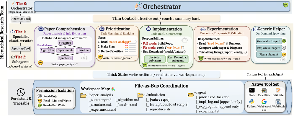 자율형 인공지능(AI) 연구는 빠르게 발전해 왔지만, 장기 호흡 머신러닝(ML) 연구 엔지니어링은 여전히 어렵습니다. 에이전트는 수 시간 또는 수일에 걸쳐 과제 이해, 환경 설정, 구현, 실험, 디버깅 전반에서 일관된 진전을 유지해야 합니다. 우리는 단순한 원칙, 즉 강력한 장기 호흡 성능에는 구조화된 오케스트레이션과 지속적인 상태 연속성이 모두 필요하다는 원칙 위에 구축된, 머신러닝 연구를 위한 자율적 장기 호흡 엔지니어링 시스템인 AiScientist를 소개합니다. 이를 위해 AiScientist는 계층적 오케스트레이션과 권한 범위가 지정된 File-as-Bus 작업공간을 결합합니다. 상위 수준의 오케스트레이터는 간결한 요약과 작업공간 맵을 통해 단계 수준의 제어를 유지하며, 전문화된 에이전트는 대화상의 인계에 주로 의존하는 대신 분석, 계획, 코드, 실험 증거와 같은 지속적인 산출물에 반복적으로 재그라운딩함으로써, 두꺼운 상태에 대한 얇은 제어를 구현합니다. 서로 보완적인 두 개의 벤치마크 전반에서 AiScientist는 가장 잘 매칭된 베이스라인 대비 PaperBench 점수를 평균 10.54점 향상시키고, MLE-Bench Lite에서 Any Medal% 81.82를 달성합니다. 또한 제거 실험은 File-as-Bus 프로토콜이 성능의 핵심 동인임을 보여줍니다. 이를 제거하면 PaperBench는 6.41점, MLE-Bench Lite는 31.82포인트 하락합니다. 이러한 결과는 장기 호흡 머신러닝 연구 엔지니어링이 순수한 국소 추론 문제가 아니라, 지속적인 프로젝트 상태 위에서 전문화된 작업을 조정하는 시스템 문제임을 시사합니다.