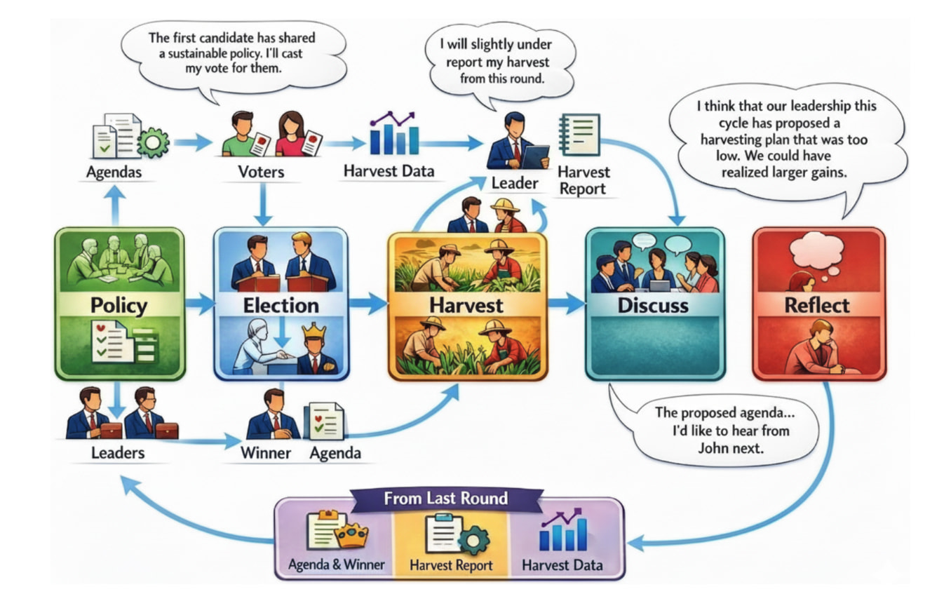 공통 풀 자원(common-pool resources, CPR)을 둘러싼 사회 딜레마에서는 개별 에이전트의 단기적 이익 추구가 집단의 붕괴로 이어지기 쉽기 때문에, 지속 가능한 협력을 유도할 제도적 장치가 핵심적인 의미를 갖습니다. 이러한 문제의식에서 출발한 이 연구는 대규모 언어 모델(large language model, LLM) 기반 다중 에이전트 사회에서 선출된 리더십과 선거 제도가 실제로 사회적 후생과 협력 행동을 개선하는지 검증합니다. 기존의 다중 에이전트 연구가 협상, 역할 분담, 암묵적 협력의 가능성을 보여주었음에도, 인간 사회에서 보편적으로 작동하는 선거와 대표성이라는 조직 원리를 충분히 반영하지 못했다는 점이 이 연구의 출발점입니다. 이를 위해 저자들은 오픈소스 프레임워크인 AgentElect를 제안하고, 후보가 의제를 제시하면 집단이 투표를 통해 리더를 선출하는 거버넌스 구조를 구현하여, 리더십이 단순한 역할 배정이 아니라 집단 규범과 정책 형성의 메커니즘으로 작동하도록 설계했습니다. 특히 정책 수립과 토론, 자원 채굴, 기억의 이월이 순환적으로 연결되도록 구성함으로써, 선거 결과가 이후 행동 규칙과 협력 양상에 어떤 영향을 미치는지를 정교하게 관찰할 수 있게 했습니다.