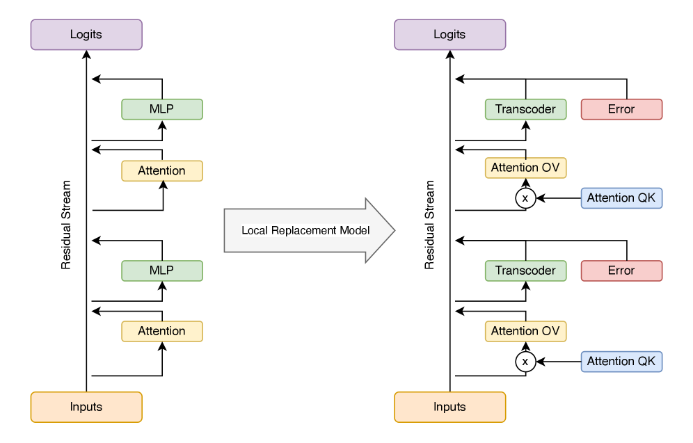 이를 위해 Qwen-3 계열(0.6B~14B)을 대상으로 매우 단순한 문법·합의 과제에서부터 더 복잡한 운율 대구 완성 과제까지 폭넓게 시험하면서, 규모가 커질수록 계획 능력이 어떻게 달라지는지를 비교했다. 특히 관사 선택처럼 짧은 범위의 과제에서는 모델 내부에 계획된 단어를 담는 해석 가능한 특징이 나타나고, 그 특징이 a와 an 같은 선택을 바꾸는 식으로 앞 문맥을 실제로 유도한다는 점을 보여주었다. 이러한 결과는 트랜스코더(Transcoder)를 이용해 내부 활성값을 해석 가능한 특징 공간으로 분해하고, 트랜스코더 특징 회로(Transcoder Feature Circuits)를 통해 미래 토큰과 선행 문맥 사이의 연결 경로를 추적함으로써 얻어졌으며, 단순한 상관관계가 아니라 인과적 메커니즘에 접근했다는 점에서 중요하다.