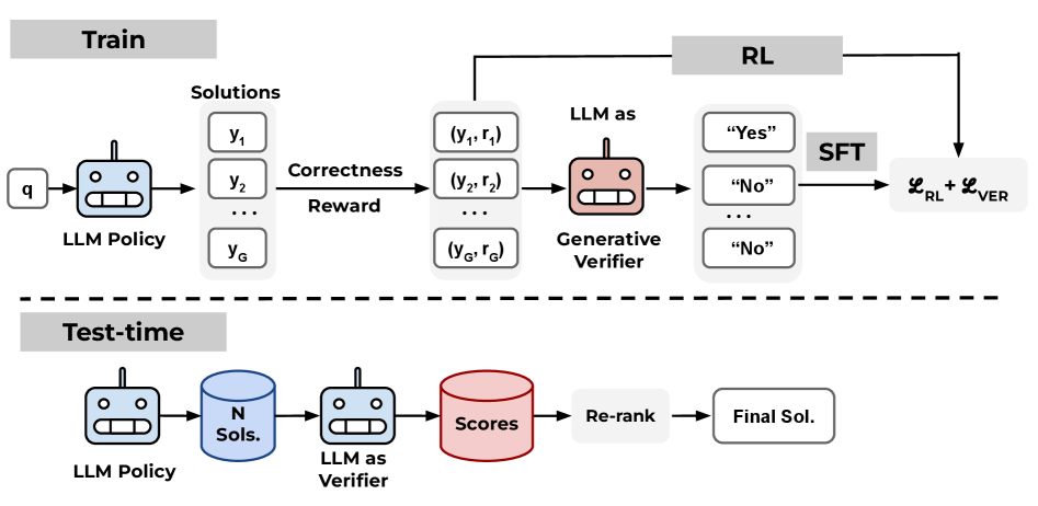 이 방법의 의의는 value-free RL이 확보한 학습 효율성과 메모리 절감 이점을 유지하면서도, 테스트 단계에서의 재랭킹과 투표에 필요한 검증 신호를 다시 모델 내부에 주입한다는 데 있다. 기존의 LLM-as-a-Judge 방식이 범용적이지만 과제 특화성이 부족하고, 별도 verifier를 학습하는 방식이 표현력은 높지만 비용이 크다는 점을 고려하면, RL^V는 그 중간 지점에서 실용적인 균형을 제시한다. 구체적으로는 RL 목적함수와 생성형 검증 손실을 결합해 단일 모델을 학습하며, 이때 검증기는 정답 여부를 “Yes” 또는 “No”로 생성하도록 훈련된다. 이러한 구성은 단순한 부가 모듈이 아니라, 병렬 샘플링, weighted voting, Best-of-N과 같은 테스트 시 계산량 활용 전략이 제대로 작동하도록 만드는 핵심 기반으로 기능한다.