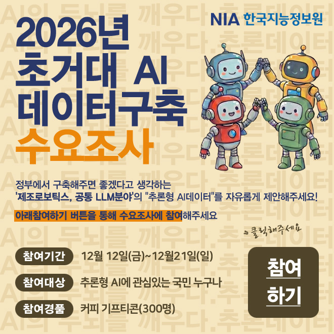 AI 기술 패러다임이 단순 학습을 넘어 ‘복합 추론(Reasoning)’과 ‘자율 판단’으로 진화함에 따라, 2026년 초거대 AI 데이터 구축 사업의 신규 과제를 기획하기 위한 “26년 초거대 AI 데이터 구축 수요조사”를 진행하고 있습니다. 본 조사는 대국민의 경험과 목소리를 반영하여, 향후 데이터 구축 과제 선정 등의 기초자료로 활용될 예정입니다. 여러분의 소중한 의견이 초거대 AI 데이터 구축 사업의 미래 전략에 직접 반영되므로, 바쁘시겠지만 잠시 시간을 내어 참여해 주시면 감사하겠습니다.