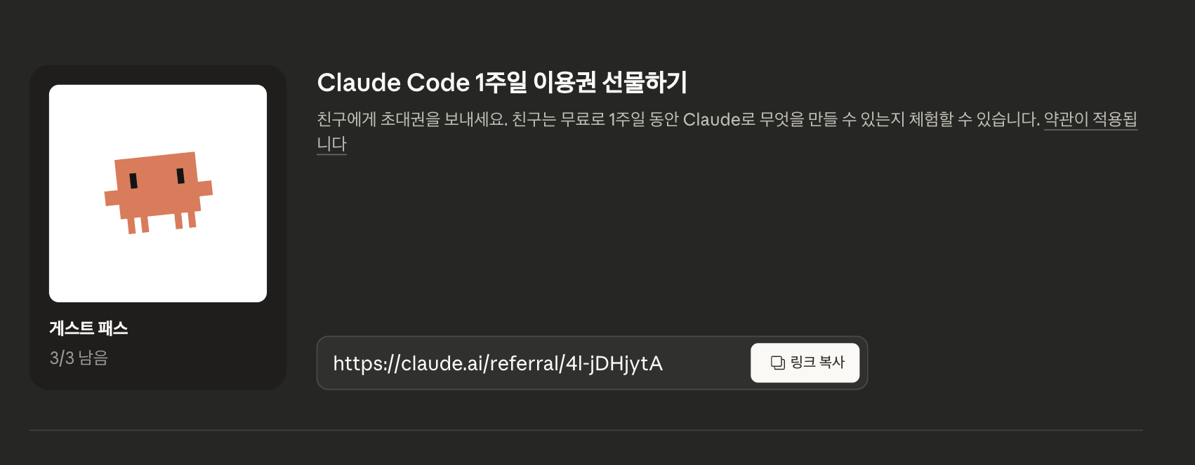 - 수령 혜택: 게스트 패스를 받은 사람은 Claude Pro 플랜(Claude Code 포함)을 7일 동안 무료로 이용할 수 있습니다.