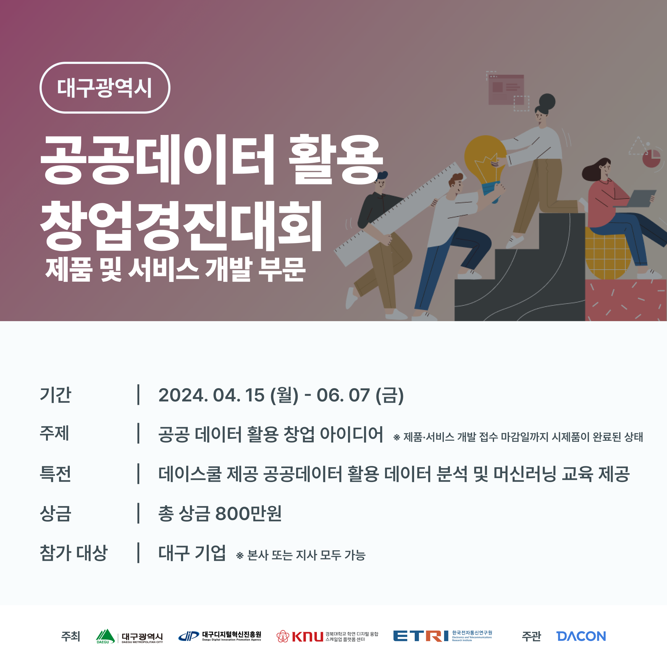 - 창업경진대회 수상작에 한하여 행정안전부 주최 「제 12회 범정부공공데이터 활용 창업 경진대회」 본선 진출 지원(2024. 9.)