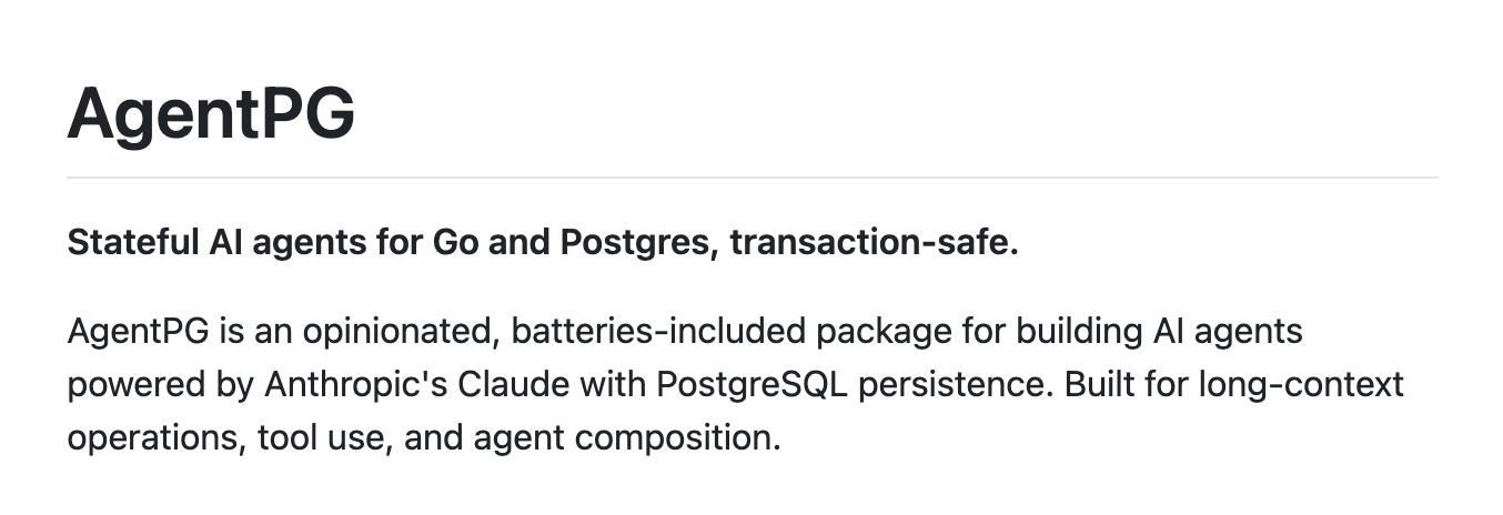 AgentPG는 개발자가 PostgreSQL 데이터베이스를 기반으로 강력하고 지속적인(Stateful) AI 에이전트를 쉽고 빠르게 구축할 수 있도록 돕는 오픈소스 프레임워크입니다. 일반적으로 AI 에이전트를 개발할 때 개발자들은 메모리 관리, 지식 검색(RAG), 그리고 도구(Tool) 실행을 위해 복잡한 애플리케이션 계층(예: LangChain 등)을 구성해야 했습니다. 하지만 AgentPG는 이러한 복잡성을 줄이고, 데이터베이스 자체를 에이전트의 '두뇌'이자 '기억 저장소'로 활용하는 데 초점을 맞춥니다.