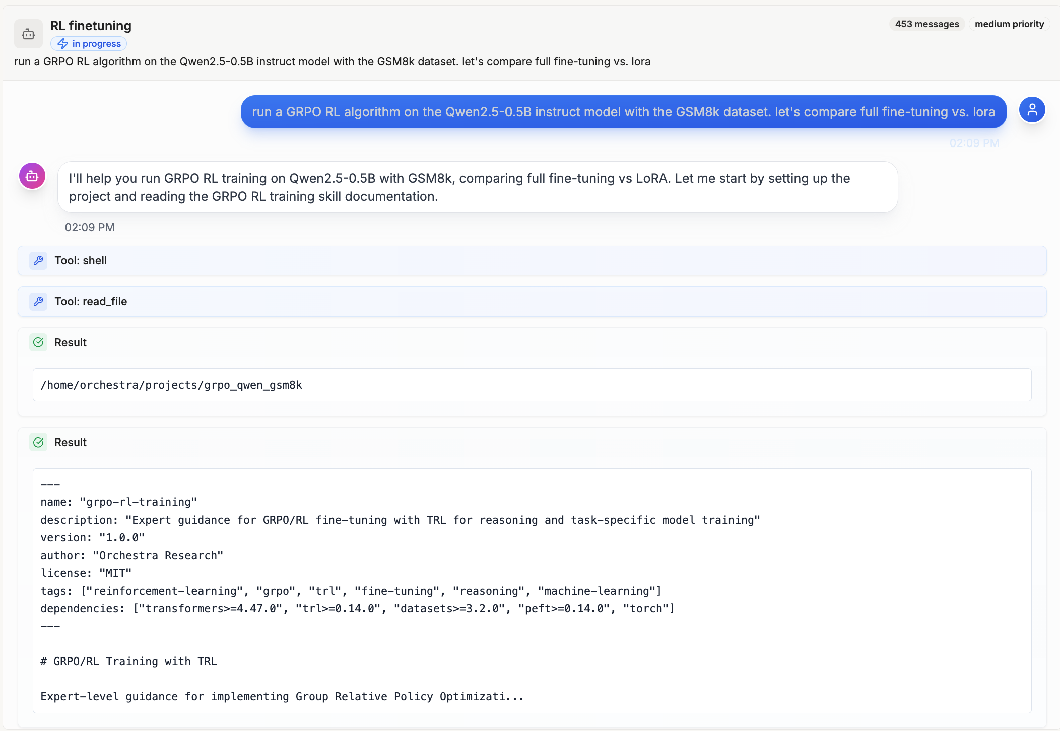 이 프로젝트의 가능성을 증명한 대표적인 사례는 Vibe Fine-tuning입니다. 이 저장소에 소개된 스킬들을 탑재한 에이전트에게 사용자가 자연어로 "LoRA 논문의 실험을 재현해줘"라고 명령을 한 결과, 에이전트는 스스로 코드를 작성하고, GPU 환경(Lambda Labs 등)을 프로비저닝하며, Axolotl을 사용하여 모델을 파인튜닝하고, 결과를 평가했습니다. 즉, 인간의 개입 없이 복잡한 ML 파이프라인을 자율적으로 완수하는 Vibe Fine-tuning이 가능했습니다.