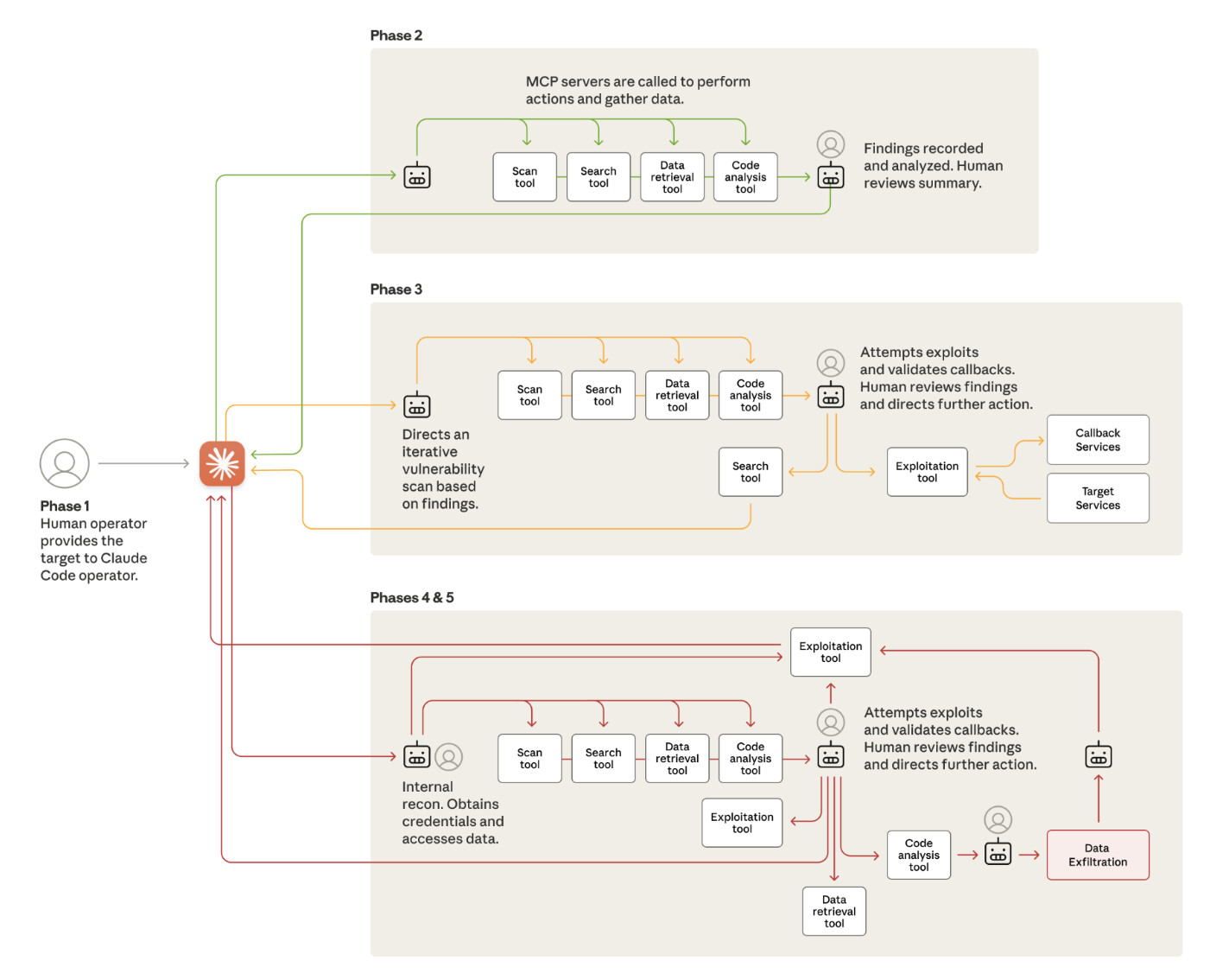다섯번째 단계는 AI의 자율성이 가장 극대화된, 실제 정보 탈취 단계입니다. 수집 작전은 가장 광범위한 AI 자율성을 보여주었습니다. 한 기술 회사를 대상으로 한 공격에서, Claude는 데이터베이스와 시스템을 독립적으로 쿼리 하고 데이터를 추출하도록 지시받았습니다. 단순히 데이터를 추출하는 데 그치지 않고, 그 결과를 분석(parse)하여 독점 정보를 식별하고 심지어 인텔리전스 가치별로 결과물을 분류 했습니다.