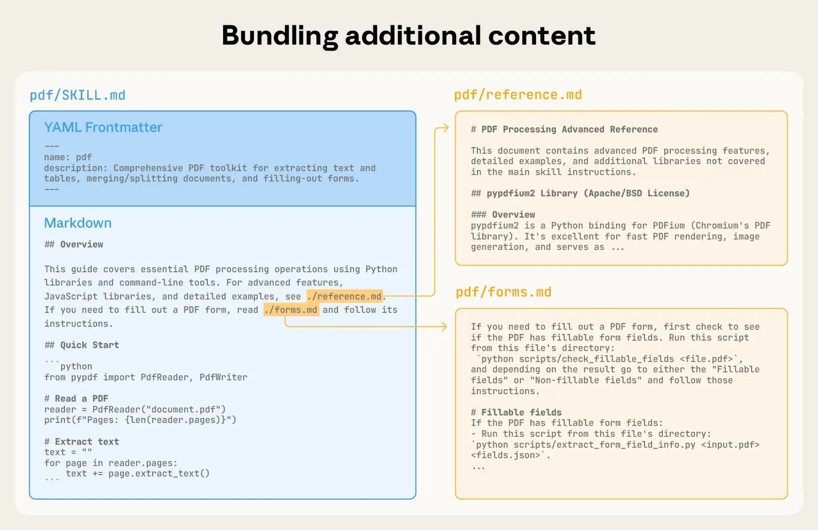 SKILL.md에서 다른 파일(예:forms.md,reference.md등)을 참조할 수 있습니다. 예를 들어, PDF 스킬을 살펴보면,forms.md에 PDF 양식(form)을 어떻게 작성해야 하는지에 대한 지침이 따로 지정되어 있으며, Claude는 실제 양식을 작성할 때에만 이forms.md파일을 불러옵니다.