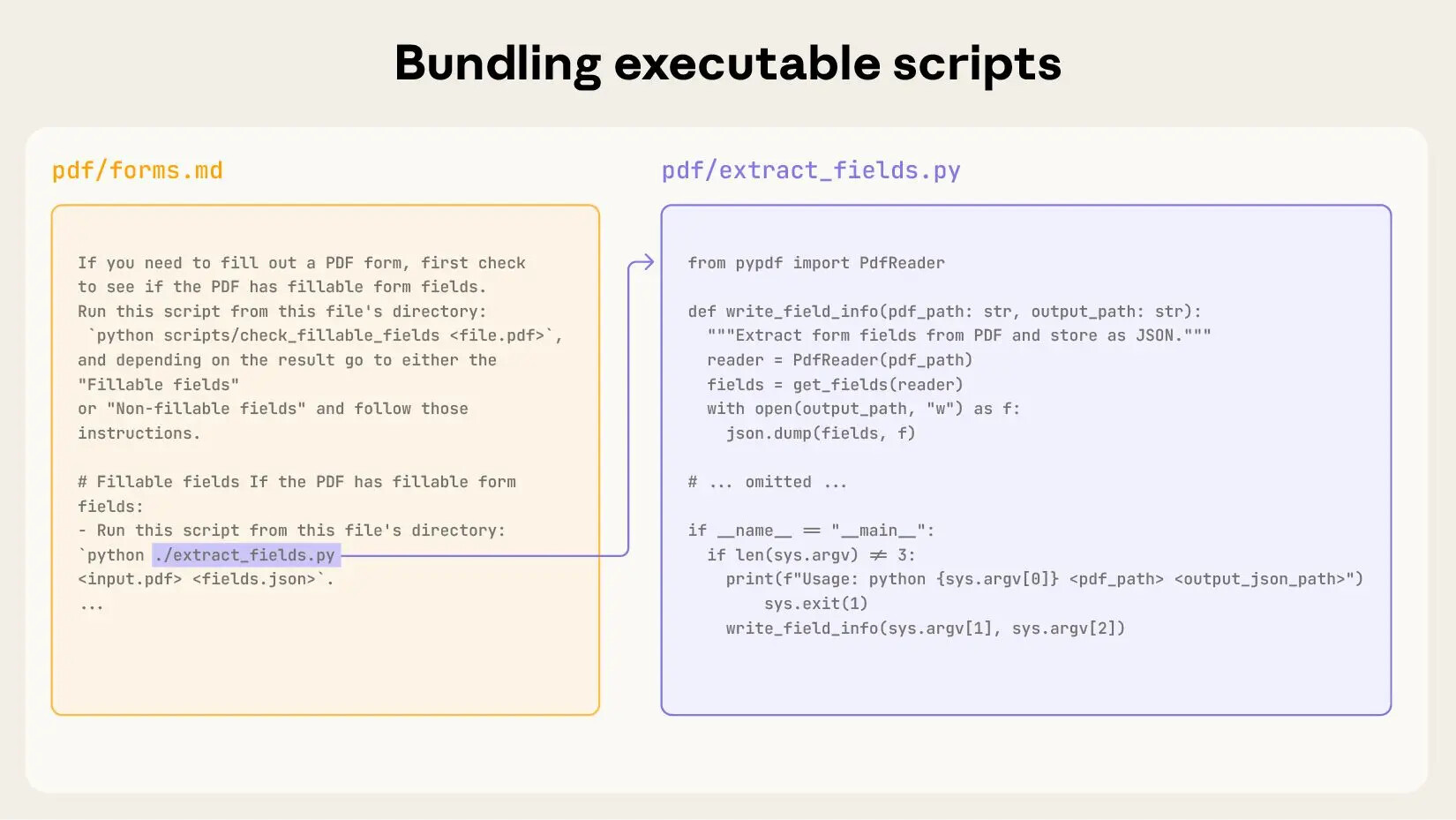 앞에서 예로 들었던 PDF 스킬에는 Python 코드가 포함되어 있으며, Claude는 이 스크립트를 실행하여 PDF의 모든 양식(form) 필드를 추출합니다. 이 때, 코드와 PDF 파일 자체는 컨텍스트에 로드되지 않으며, Claude는 단순히 코드를 실행만 합니다.