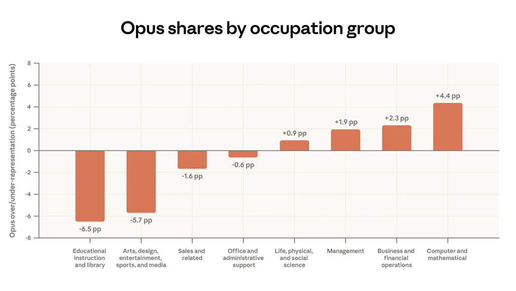 유료 Claude.ai 계정의 경우, 컴퓨터 및 수학 관련 작업의 55%가 Opus를 사용하는 반면, 교육 관련 작업은 45%만 Opus를 사용합니다. 더 세밀하게 보면, 소프트웨어 개발자 작업의 34%가 Opus를 사용하는 반면, 튜터링 작업은 12%에 그칩니다.