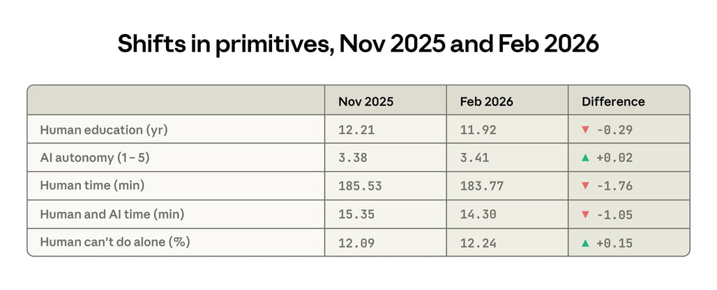 여러 기본 지표(Primitive)들에서도 비슷한 복잡도 하락이 관찰되었습니다. 사용자 입력에 필요한 평균 교육 연수(the average years of education required for the human inputs)가 12.2년에서 11.9년으로 줄었고, 사용자가 AI에 더 많은 자율성을 부여하며, 사람이 해당 작업을 혼자 수행하는 데 필요한 시간도 약 2분 감소했습니다.