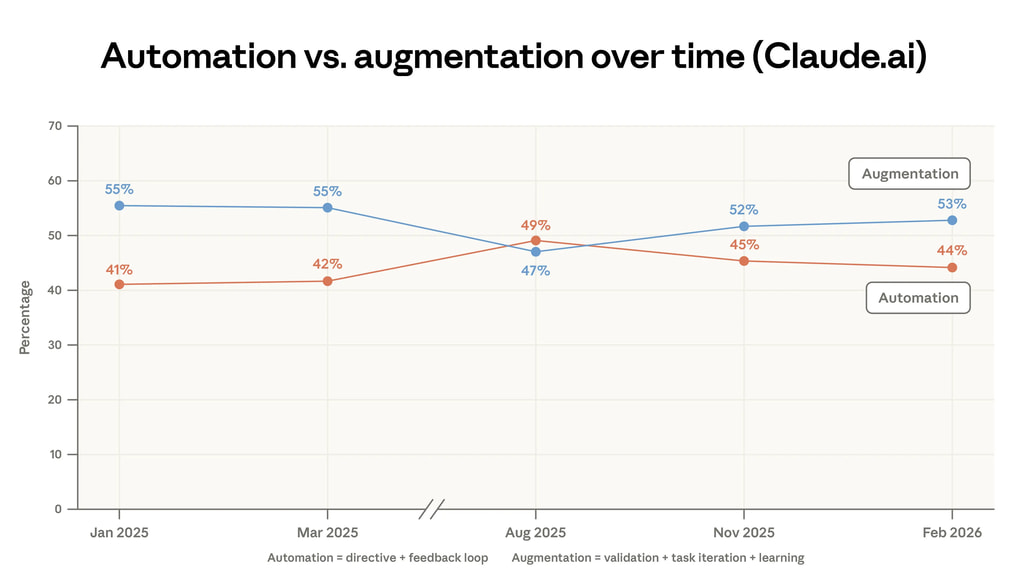 Anthropic Economic Index 보고서는 대화를 지시형(Directive), 피드백 루프(Feedback Loop), 작업 반복(Task Iteration), 검증(Validation), 학습(Learning)의 5가지 상호작용 유형으로 분류하고, 이를 자동화(Automation)와 증강(Augmentation) 두 범주로 묶습니다. 이 중 Claude.ai 에서는 증강 비율이 소폭 상승했는데, 이는 검증과 학습 패턴의 증가에 기인합니다.