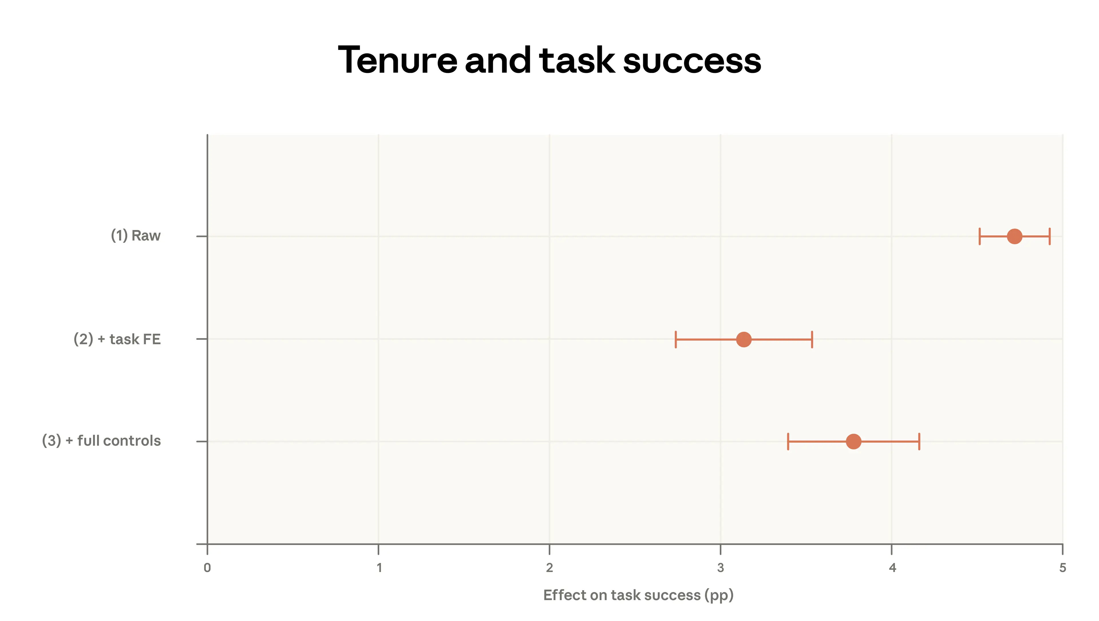 이 질문에 답하기 위해 O*NET 작업과 요청 클러스터에 대한 고정 효과(fixed effects)를 추가하여 동일한 작업 내에서 고경력과 저경력 사용자를 비교했습니다. 이렇게 통제한 결과에서도 약 3%p의 성공률 차이가 유지되었습니다. 모델 선택, 사용 사례, 국가까지 통제한 최종 분석에서는 오히려 4%p로 약간 더 높은 효과가 나타났습니다.