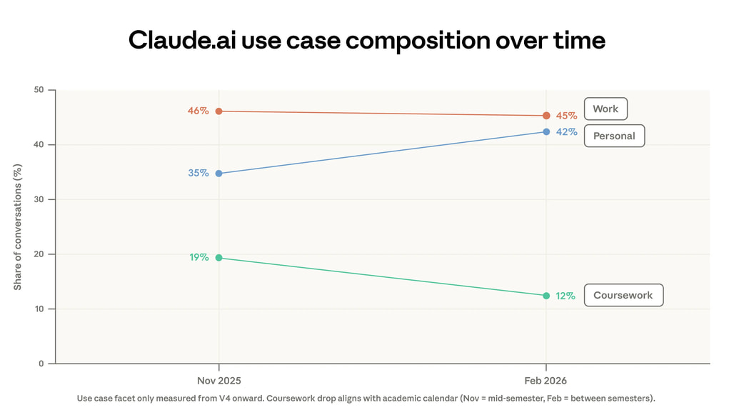 사용 사례의 변화도 주목할 만합니다. 학업 관련 사용은 19%에서 12%로 줄어든 반면, 개인적 사용은 35%에서 42%로 증가했습니다. 학업 사용 감소의 일부는 겨울 방학 시기와 겹친 영향이며, 2월부터 늘어난 신규 가입으로 보다 캐주얼한 AI 사용자가 유입된 것으로 분석됩니다.