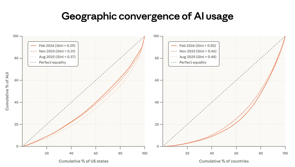 이번 Anthropic Economic Index 보고서는 노동 시장에 중요한 함의를 가집니다. 경제학자들이 오래 전부터 논의해 온 기술 편향적 기술 변화(skill-biased technological change) 개념과 연결되는데, 고숙련 작업을 수행하는 초기 채택자들이 후기 채택자보다 Claude와의 상호작용에서 더 높은 성공률을 보이면서, 이들 사이의 격차가 벌어질 수 있다는 것입니다.