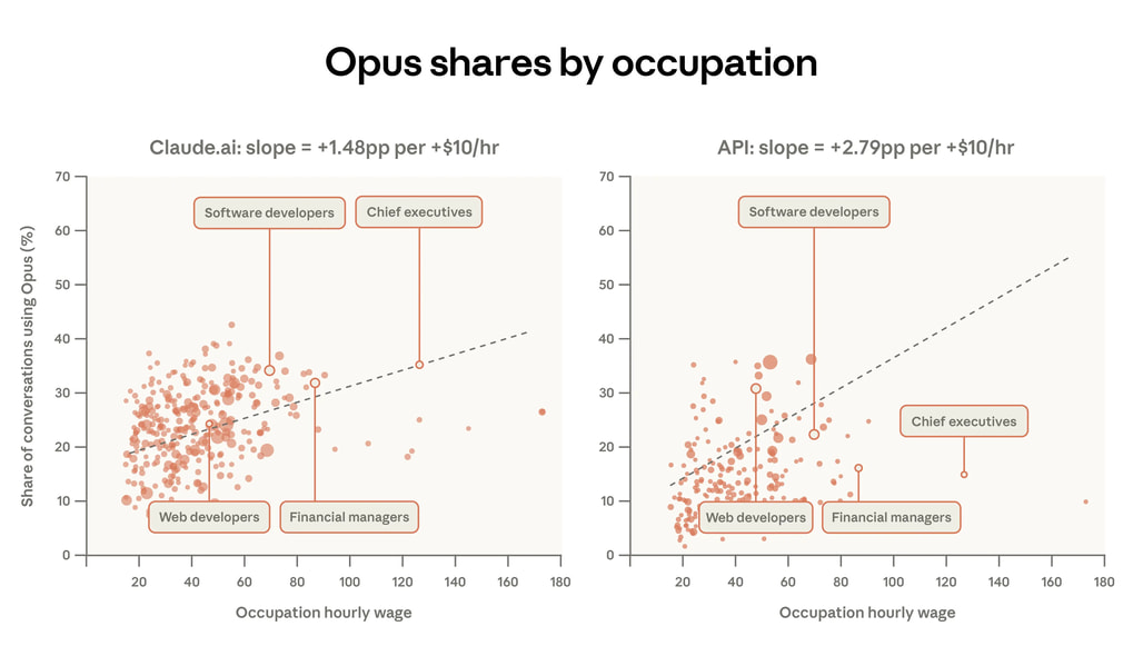 Claude의 모델 클래스(Haiku, Sonnet, Opus)는 비용, 속도, 성능 간의 트레이드오프를 제공합니다. 사용자들이 이를 인식하고 작업에 맞게 모델을 선택한다면, 가장 복잡하고 가치 있는 작업에 Opus를, 단순한 작업에는 다른 모델을 사용할 것입니다. 실제로 데이터에서 이러한 패턴이 관찰됩니다.