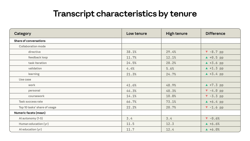 핵심 발견은 명확합니다. 오래 사용한 사용자일수록 Claude의 역량을 더 잘 활용하는 습관과 전략을 발전시켜, 더 높은 가치의 작업을 시도할 뿐만 아니라 대화에서 성공적인 응답을 끌어낼 확률도 높아진다는 것입니다.