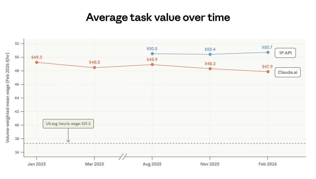 사용 사례가 다양해지면서, Claude에서 수행되는 작업의 평균 경제적 가치(해당 직업의 미국 평균 시급 기준)도 소폭 하락했습니다. Claude.ai에서의 평균 작업 가치는 $49.3에서 $47.9로 낮아졌는데, 이는 스포츠 결과 확인, 제품 비교, 주택 관리 같은 단순 질의가 늘어난 영향입니다.