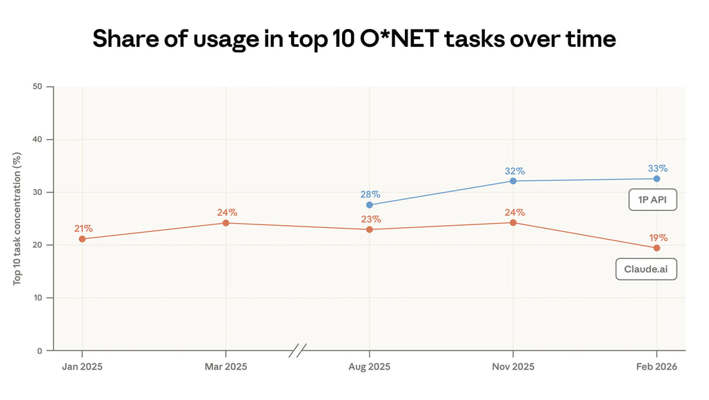 코딩은 여전히 Claude 플랫폼에서 가장 흔한 용도로, 컴퓨터 및 수학 관련 직업에 해당하는 작업이 Claude.ai 대화의 35%를 차지합니다. 하지만 2025년 11월과 2026년 2월 사이에 Claude.ai의 사용 사례는 눈에 띄게 다양해졌습니다. 상위 10개 O*NET 작업이 전체 대화에서 차지하는 비율이 24%에서 19%로 감소했습니다.