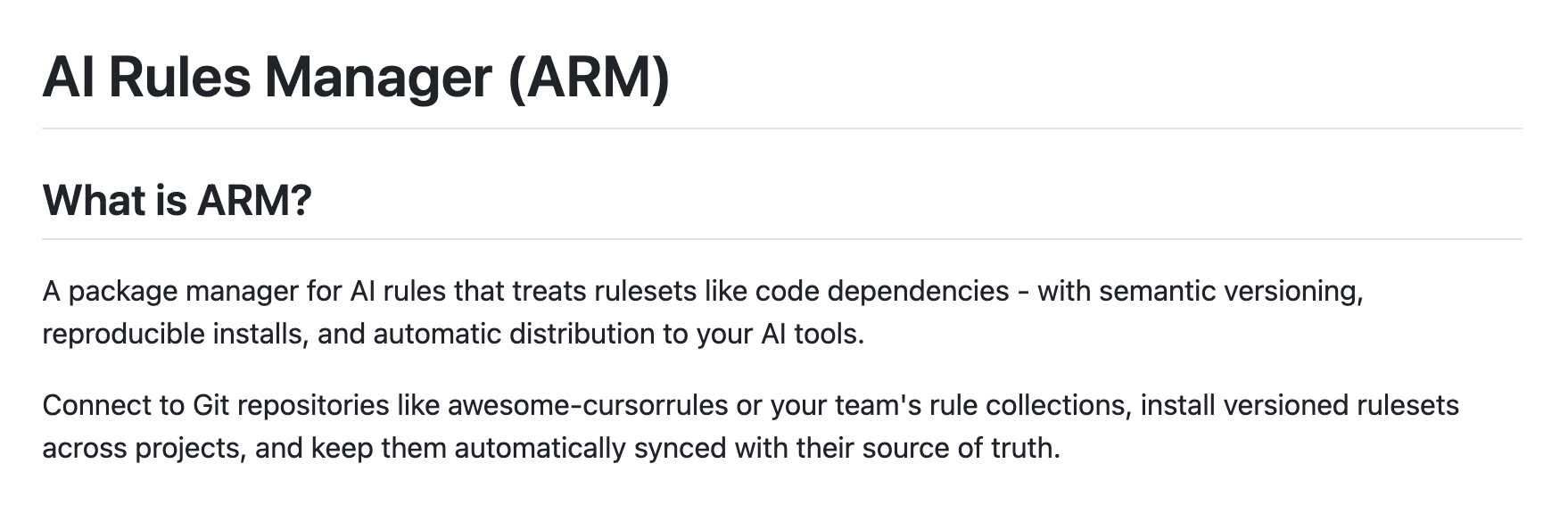 따라서 ARM은 AI 규칙 관리에 있어서 “npm for AI rules” 라고 볼 수 있으며, 팀 협업과 대규모 프로젝트 관리에 특히 강력한 이점을 제공합니다.