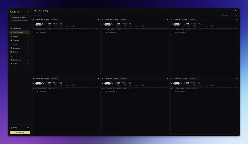 Auto-Claude는 최대 12개의 에이전트를 동시에 구동할 수 있는 강력한 병렬 처리 능력을 갖추고 있습니다. 이러한 다중 작업 상황을 사용자가 직관적으로 파악하고 관리할 수 있도록, Trello나 Jira와 유사한 칸반 보드(Kanban Board) 인터페이스를 제공합니다.