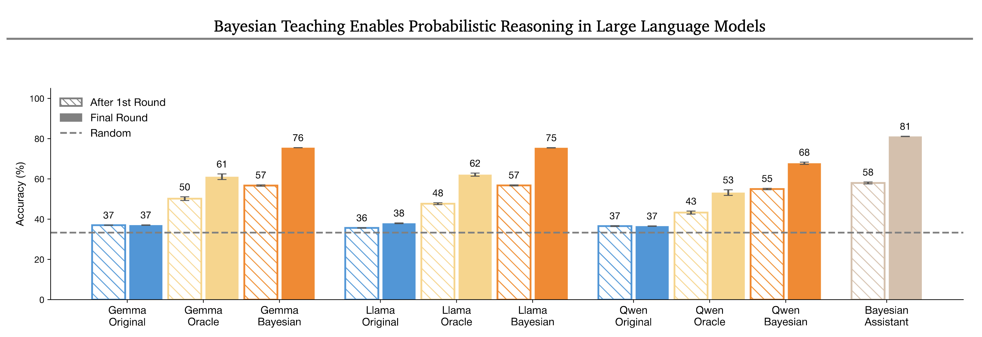 그러나 이 결과에는 깊은 통찰이 담겨 있습니다. 오라클은 불확실성이 없는 상황만을 보여주므로, LLM은 "정보가 부족할 때 어떻게 행동해야 하는가"를 배우지 못합니다. 오라클의 추천은 라운드 간 변화가 없기 때문에, LLM이 "증거를 반영한 업데이트"라는 개념 자체를 학습할 기회가 없습니다. 반면 베이지안 어시스턴트의 행동에는 불확실성을 다루는 전략, 즉 정보가 부족할 때 탐색하고, 새로운 증거가 축적되면서 점진적으로 확신을 높여가는 과정이 자연스럽게 포함되어 있습니다.