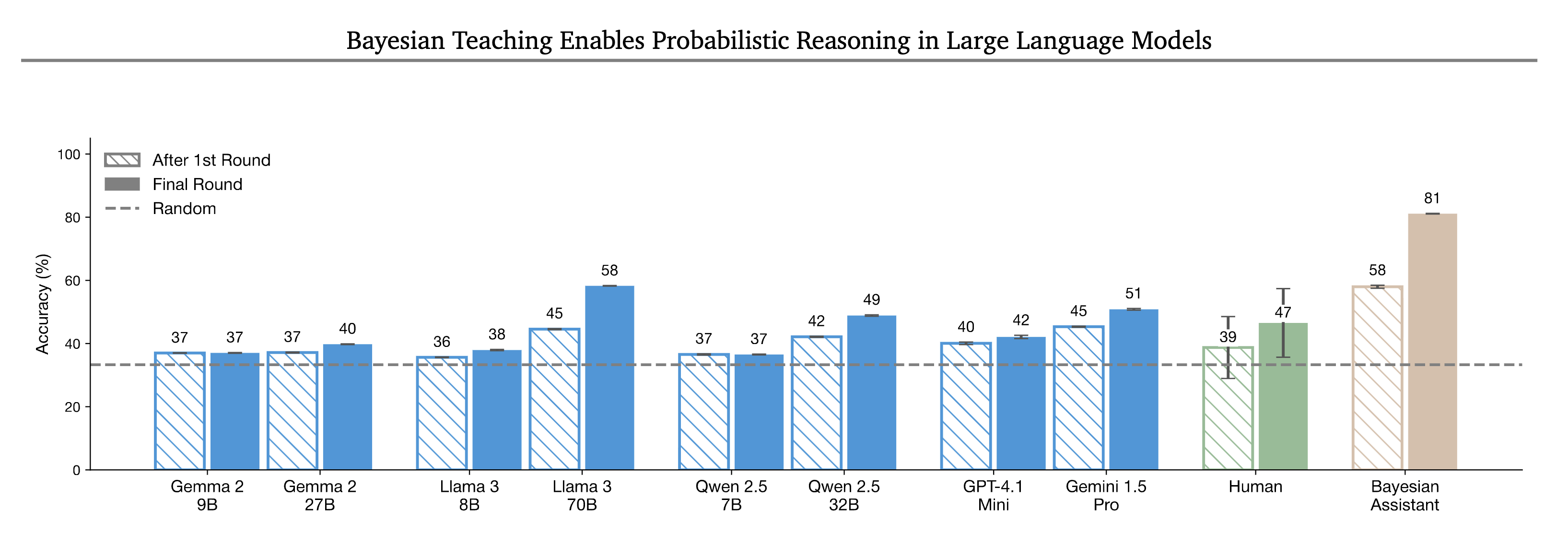 특히 주목할 점은, LLM의 성능이 단 한 번의 상호작용 이후 정체되어, 새로운 정보에 적응하는 능력이 제한적이라는 발견입니다. 베이지안 어시스턴트는 라운드가 진행될수록 꾸준히 정확도가 상승한 반면, LLM은 첫 라운드 이후 성능 향상이 거의 없었습니다. 5라운드의 상호작용 끝에도 LLM의 정확도는 첫 라운드와 크게 다르지 않았던 것입니다.