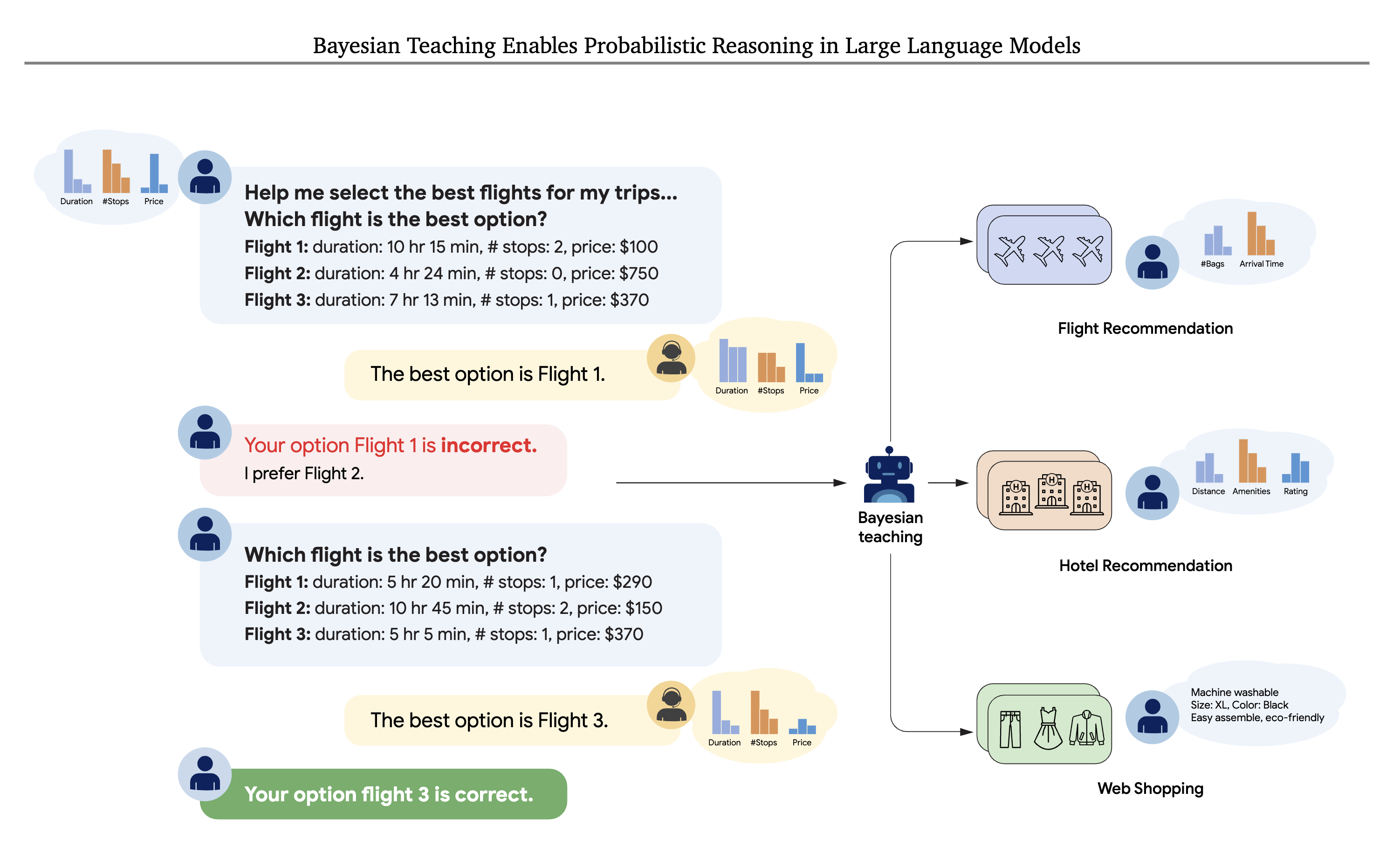 속성 간 상호작용이 복잡한 경우(예: "가격이 저렴하면 경유도 감수하지만, 비싸면 반드시 직항이어야 한다"와 같은 조건부 선호)에서도 베이지안 티칭이 효과적인지 역시 향후 검증이 필요합니다. 그럼에도 불구하고, 비교적 단순한 합성 데이터에서의 훈련이 실제 웹 쇼핑 과제로 전이되었다는 결과는 이 접근법의 잠재력을 충분히 보여줍니다. 앞으로 더 복잡한 베이지안 모델(예: 계층적 베이지안 모델이나 비모수 베이지안 모델)로부터 생성된 시연 데이터를 활용한다면, LLM의 확률적 추론 능력을 더욱 정교하게 발전시킬 수 있을 것으로 기대됩니다.