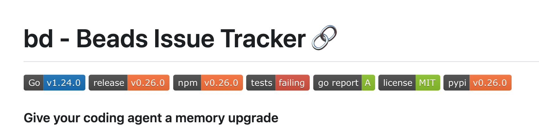 Beads는 스티브 예기(Steve Yegge)가 공개한 AI 코딩 에이전트를 위한 경량 그래프 기반 이슈 트래커입니다. 이 프로젝트는 단순히 버그나 할 일 목록을 관리하는 도구가 아니라, AI 에이전트가 긴 작업 흐름 속에서 장기 기억(Long-term Memory) 을 유지하고 복잡한 작업을 체계적으로 수행할 수 있도록 돕는 시스템입니다.