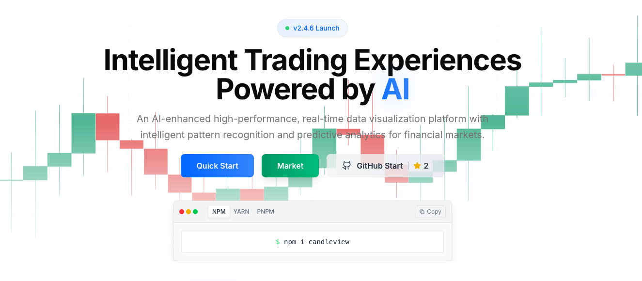 CandleView는 AI(인공지능) 기술이 통합된 금융 시계열 데이터(Financial Time-Series Data) 시각화 및 렌더링 엔진입니다. React 기반의 컴포넌트로 제공되며, 주식이나 암호화폐 거래소에서 흔히 볼 수 있는 캔들스틱(Candlestick) 차트를 렌더링하는 것을 넘어, LLM(대규모 언어 모델)을 차트 분석에 직접 활용할 수 있도록 설계된 것이 가장 큰 특징입니다.