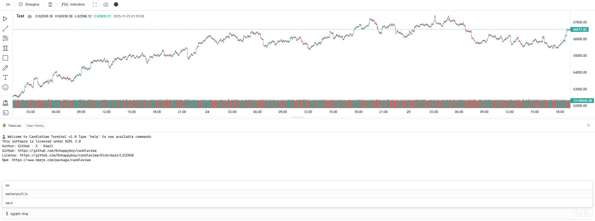 CandleView에는 차트 내부에 내장 터미널(CLI, Command Line Interface)이 내장되어 있어, 명령어로 테마를 변경하거나 지표를 켜고 끌 수 있습니다. (예: open ma, theme dark)