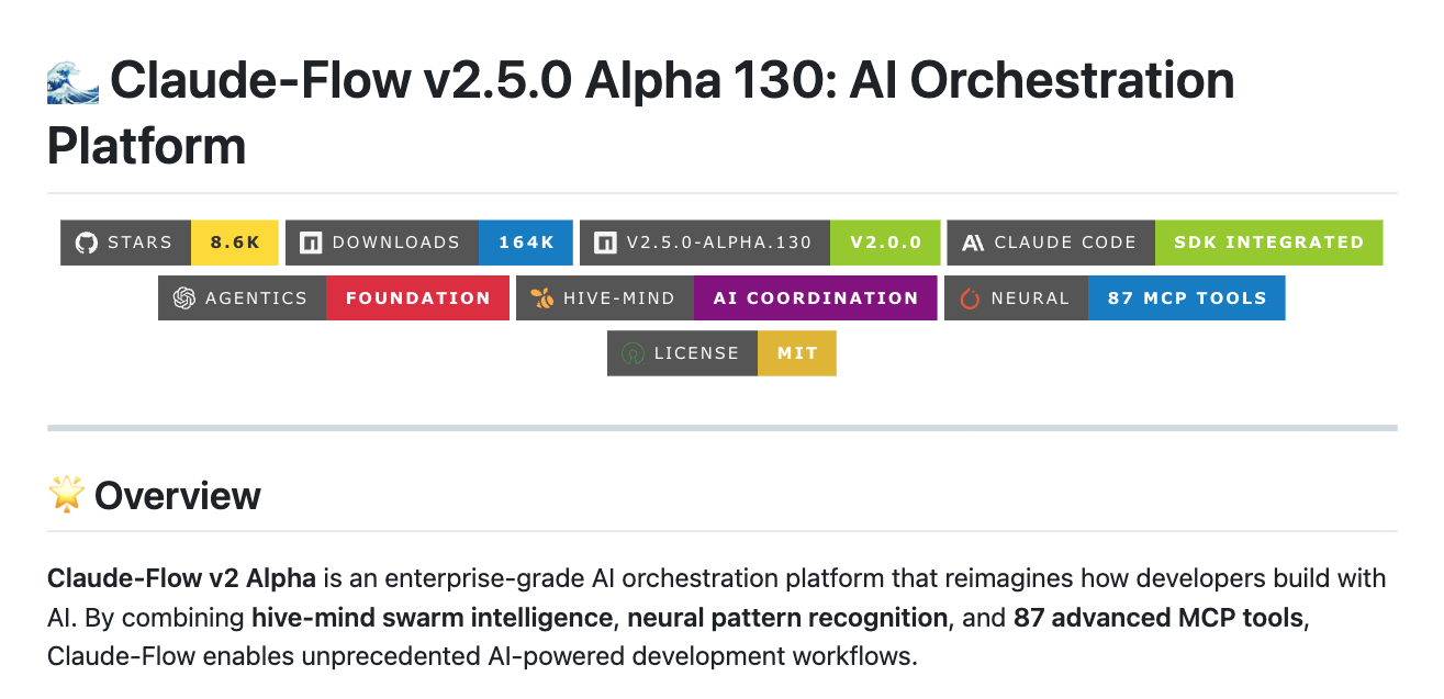 Claude-Flow는 인공지능 기반 개발 환경을 완전히 새롭게 정의하는 오픈소스 AI 오케스트레이션 플랫폼(AI Orchestration Platform) 입니다. 이 프로젝트는 여러 AI 에이전트를 협력적으로 제어하고 자동화된 개발 워크플로우를 구성할 수 있도록 설계된 시스템으로, 단일 AI 모델이 아니라 ‘스웜(Swarm)’과 ‘하이브 마인드(Hive-Mind)’ 개념을 기반으로 한 다중 에이전트 시스템(Multi-Agent System) 을 제공합니다.