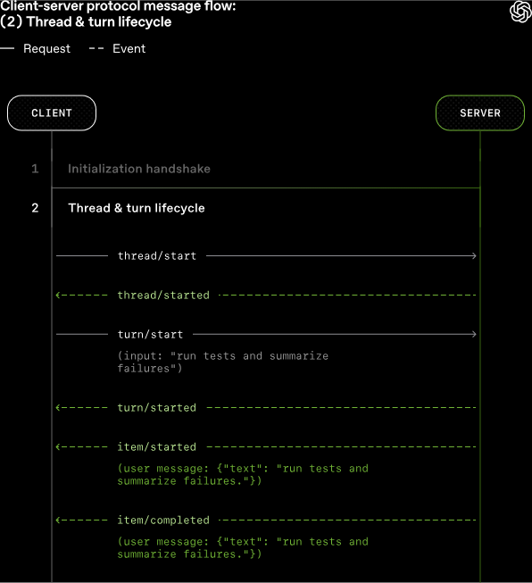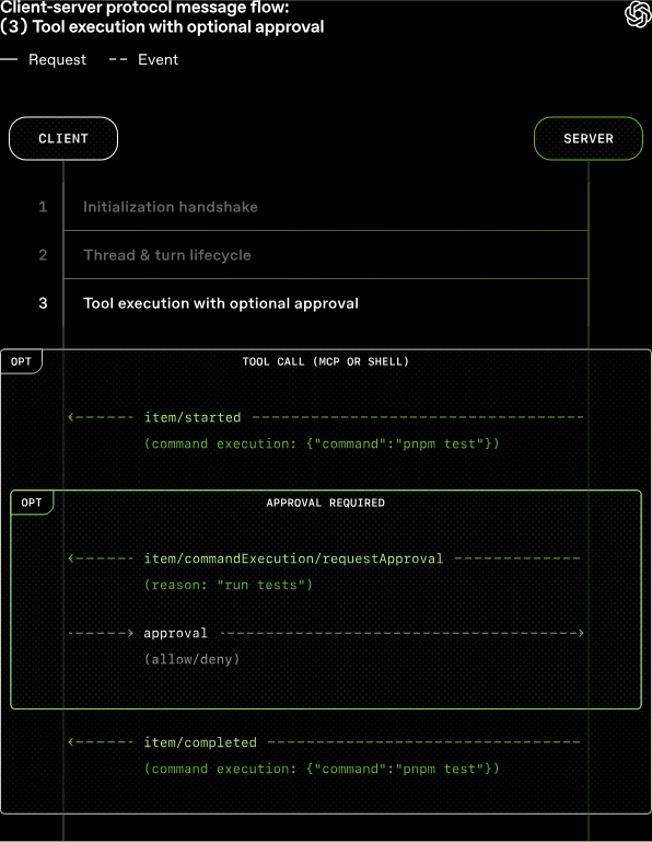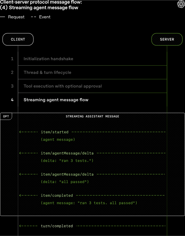 실제 프로토콜의 통신 흐름은 클라이언트의 단일 initialize 요청과 서버의 버저닝/기능 플래그 동의 응답으로 이루어지는 초기화 핸드셰이크로 시작됩니다. 이후 스레드와 턴이 생성되면서 클라이언트는 셸 명령 실행 등 도구 사용 시 '허용(allow)' 또는 '거부(deny)'와 같은 권한 승인 응답을 서버에 보낼 수 있으며, 모델의 코드 생성 메시지 또한 델타(delta) 이벤트 형태로 실시간 스트리밍되어 지연 없는 사용자 경험을 제공합니다.