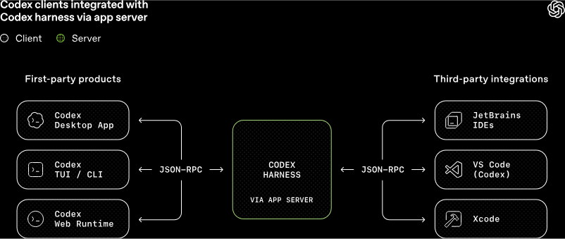 OpenAI의 강력한 인공지능 코딩 에이전트인 Codex는 웹 애플리케이션(Web App), 터미널 명령줄 인터페이스(CLI), 통합 개발 환경(IDE) 익스텐션, 그리고 최근 출시된 macOS 데스크톱 앱 등 다양한 환경에서 구동됩니다. 겉보기에는 서로 다른 형태의 인터페이스를 가지고 있지만, 그 이면에는 모두 동일한 Codex 하네스(harness)가 핵심 에이전트 루프와 로직을 구동하고 있습니다. 이러한 다양한 개발자 환경과 Codex의 핵심 코어 로직을 이어주는 결정적인 연결 고리가 바로 클라이언트 친화적인 양방향 JSON-RPC API로 설계된 Codex App Server입니다. 이 App Server를 통해 개발자들은 Codex의 강력한 코드 분석 및 생성 능력을 자신만의 제품이나 사내 워크플로우에 매우 쉽고 일관성 있게 통합할 수 있습니다.