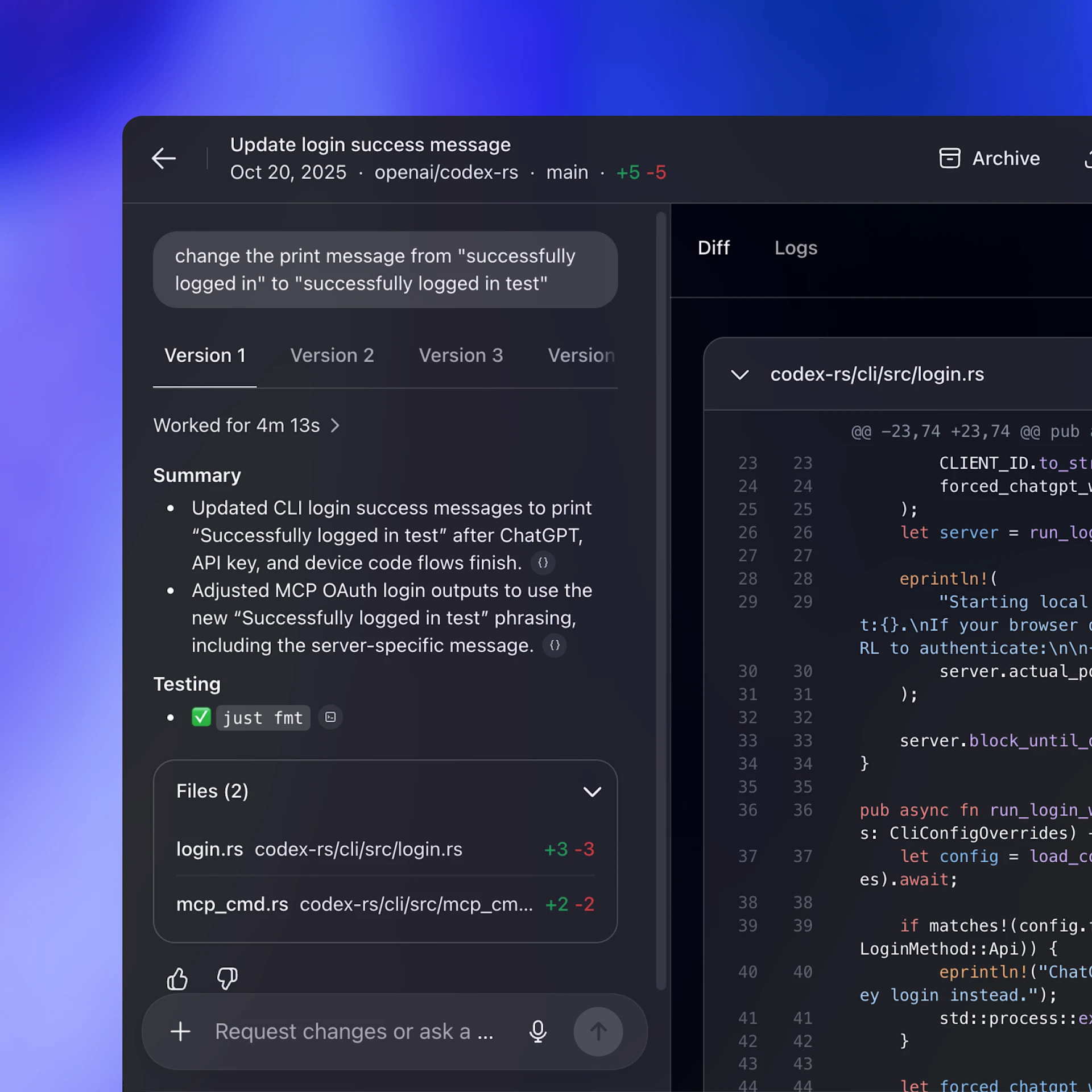 Codex Exec: CI/CD 파이프라인이나 일회성 자동화 작업에 초점을 맞춘 가벼운 스크립트 기반 CLI 모드입니다. 사용자의 개입이 없는 비대화형으로 실행을 완료하고 구조화된 로그를 출력하며, 성공 또는 실패 신호를 파이프라인에 명확히 반환해야 하는 백그라운드 환경에 유용합니다.