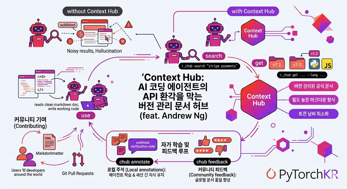 AI 코딩 에이전트를 사용하다 보면 존재하지 않는 API를 당연한 듯 호출하거나, 이미 지원 종료된 메서드를 사용하는 코드를 생성하는 환각(Hallucination) 현상을 자주 마주치게 됩니다. 이 문제는 LLM의 학습 데이터 자체가 정적이어서, 빠르게 업데이트되는 라이브러리와 API의 최신 스펙을 반영하지 못하는데에서 비롯됩니다. 또한 에이전트가 한 세션에서 새로운 API 사용법을 학습하더라도 다음 세션에서는 이를 기억하지 못해 같은 시행착오를 반복합니다. Andrew Ng의 AI 제품 팀(aisuite)이 공개한 context-hub는 이 두 가지 문제를 동시에 해결하려는 오픈소스 CLI 도구입니다.