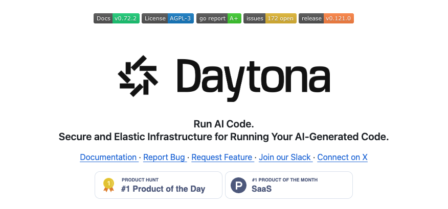 Daytona는 AI 에이전트가 생성한 코드를 안전하게 실행할 수 있는 격리된 보안 샌드박스(Secure Sandbox) 인프라이자, 개발자를 위한 오픈소스 개발 환경 관리(Development Environment Management, DEM) 도구입니다.