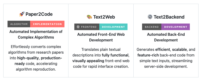 DeepCode와 비슷한 영역의 도구로는 GitHub Copilot, Replit Agent, Cursor IDE 플러그인 등이 있습니다. 그러나 이들 대부분은 코드 자동완성이나 단일 함수 수준의 보조에 가까운 반면, DeepCode는 논문에서부터 웹 애플리케이션까지 아우르는 프로젝트 단위 코드 자동화를 지원합니다. 특히 연구 논문을 코드로 변환하는 Paper2Code, 텍스트 설명을 기반으로 프론트엔드와 백엔드를 자동 구현하는 Text2Web과 Text2Backend 기능은 기존 툴에서 보기 어려운 차별화된 특징입니다.