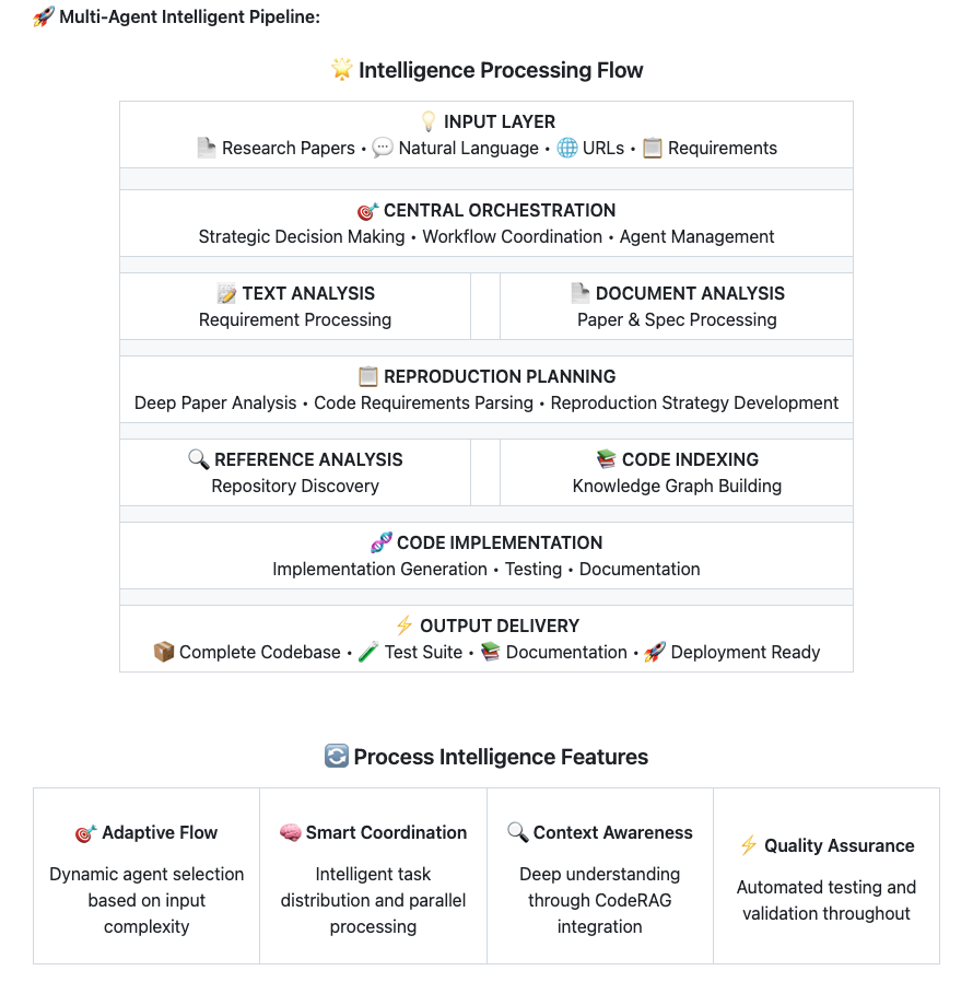 DeepCode의 핵심 철학은 “Where AI Agents Transform Ideas into Production-Ready Code”라는 슬로건에서도 드러나듯, 아이디어와 텍스트를 실제 동작하는 코드로 전환하는 것입니다. 이를 위해 문서 이해, 아키텍처 설계, 코드 생성, 품질 보증 등을 담당하는 다양한 특화 에이전트들이 협업하여 하나의 파이프라인을 완성합니다.